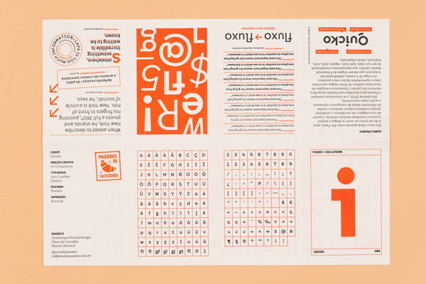 Type specimen impresso para a colaboração entre ESTÚDIO PASSEIO e ANA LAYDNER. O cartaz-folder sintetiza as principais características da Quicko, mostrando a versatilidade da família, a extensão do character set, os recursos Open Type disponíveis e os detalhes nos desenhos das letras. Crédito das fotos: Rodrigo Lins.